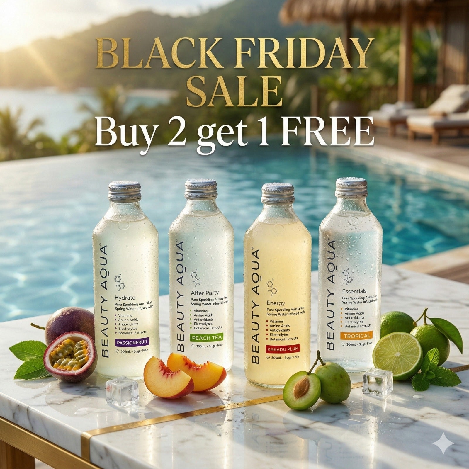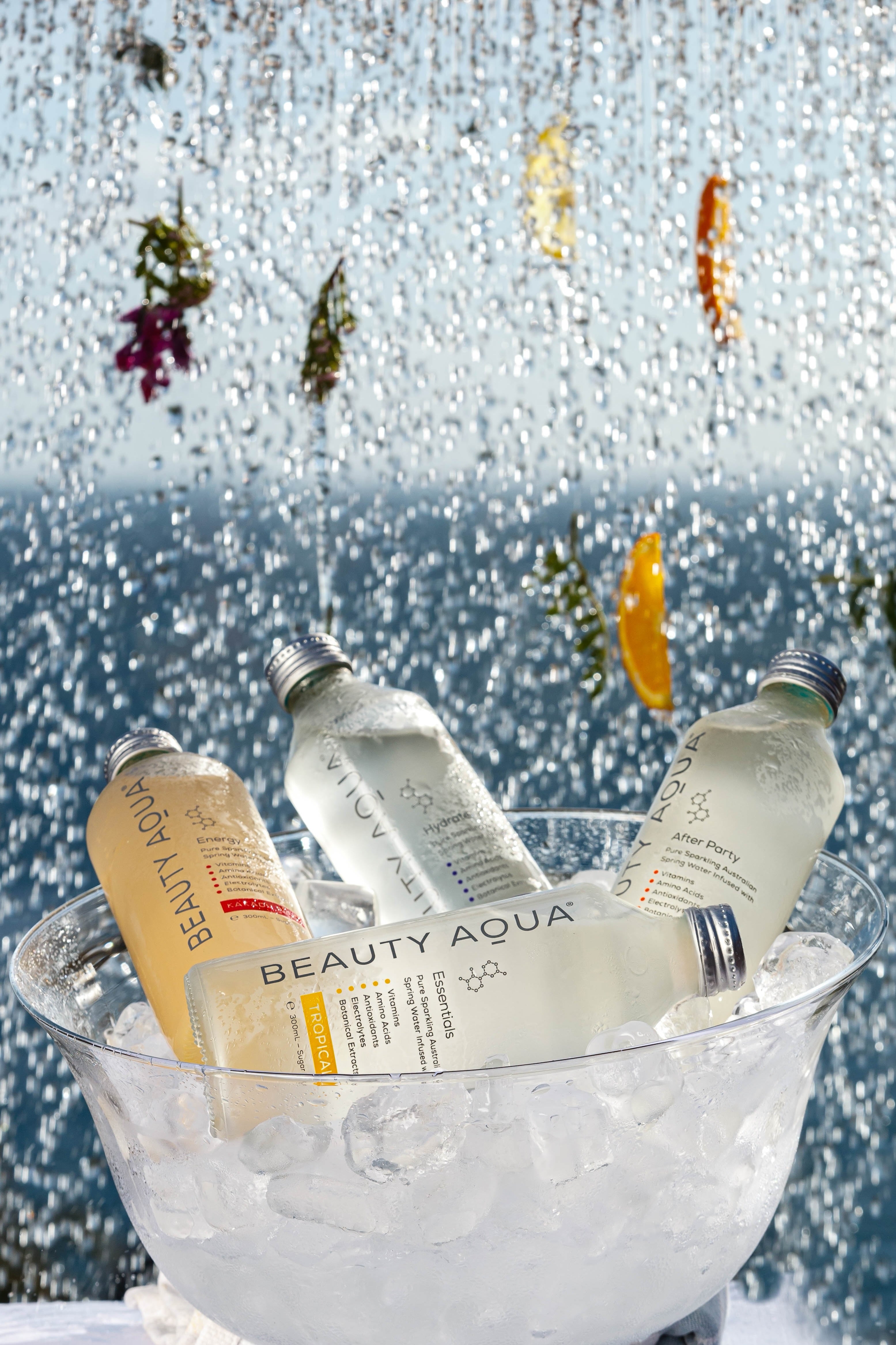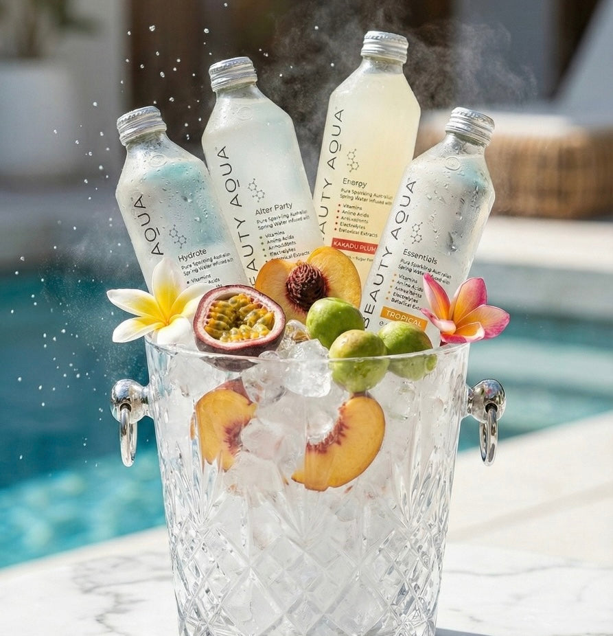 Pure Australian Blue Mountains Spring Water combined with meticulously sourced highest quality potent nutrients. Every ingredient in BEAUTY AQUA is backed by scientific peer reviewed double blind placebo - test studies published in medical and dermatology journals. Our formula combines essential vitamins & minerals, amino acids, polyphenols, antioxidants, electrolytes, pure cold pressed botanicals & hyaluronic Acid. Each ingredient is carefully selected to deliver tangible benefits for your radiance, vitality, cell protection, replenishment and overall wellness.
